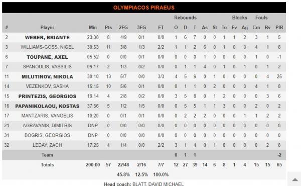 Οσο για τον Ολυμπιακό; Ο Νίκολα Μιλουτίνοφ ήταν ο κορυφαίο με 13 πόντους και 9 ριμπάουντ, την ώρα που ο Σάσα Βεζένκοφ ήταν εξίσου θετικός με 10 ποντους, σε ένα ματς που το συγκρότημα του Μπλατ είχε το αξιολύπητο 2/16 από την γραμμή του τριπόντου.