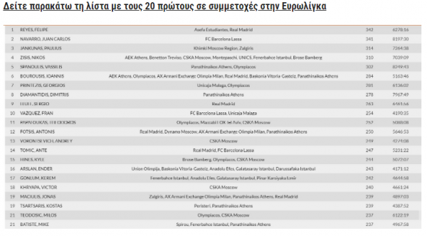 Ο Ελληνας γκαρντ είναι 4ος με 310 όμως πλέον δεν αγωνίζεται στην Ευρωλίγκα, καθώς η ομάδα του συμμετέχει στο Champions League.