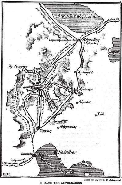 Χάρτης της μάχης των Δερβενακίων. Σε αυτήν τη μάχη λέγεται ότι ο Νικηταράς έσπασε τέσσερα σπαθιά. Όταν μάλιστα έσπασε και το τέταρτο, το χέρι του έπαθε αγκύλωση και χρειάστηκε γιατρός για να του ανοίξει το χέρι και να βγάλει το σπαθί.