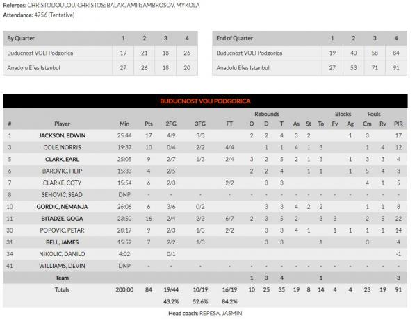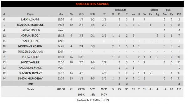 Κυριαρχώντας κάτω από τα δύο καλάθια με ηγέτες τους Πλάις και Ντάνστον, η Εφές πέρασε εύκολα από το Μαυροβούνιο επικρατώντας της Μπουντούτσνοστ με 91-84 για την 28η αγωνιστική.