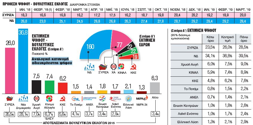 Μεγάλη παραμένει η διαφορά -στις 8,4 μονάδες- ανάμεσα στη ΝΔ (28,4%) και στον ΣΥΡΙΖΑ (20%) στην πρόθεση ψήφου για τις επερχόμενες βουλευτικές εκλογές, όταν η κυβέρνηση αποφασίσει την ημερομηνία διεξαγωγής τους, με την αξιωματική αντιπολίτευση να εστιάζει στο στόχο της αυτοδυναμίας.
