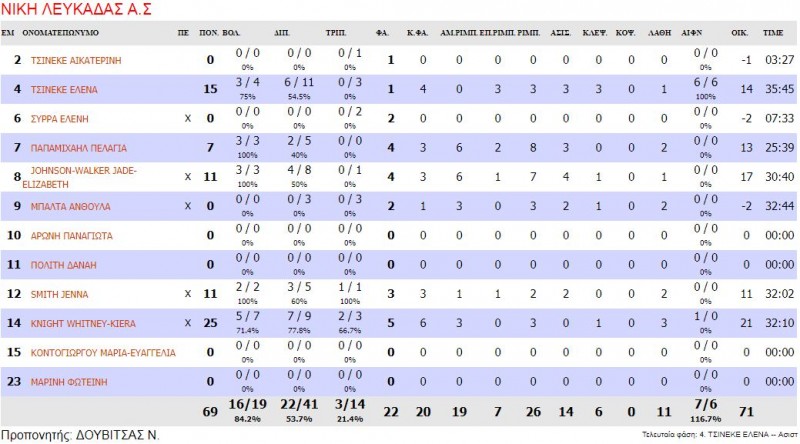 Νίκη Λευκάδας (Δουβίτσας): Τσινέκε Κ., Τσινέκε Ελ. 15, Σύρρα, Παπαμιχαήλ 7, Τζόνσον Ουόκερ 11, Μπαλτά, Σμιθ 11(1), Νάιτ 25(2).
