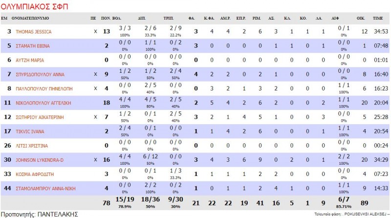 Ολυμπιακός (Παντελάκης): Τόμας 13(2), Σταμάτη 2, Αυτζή, Σπυριδοπούλου 9(2), Παυλοπούλου 4, Νικολοπούλου 18)2), Σωτηρίου 7(2), Τίκβιτς 2, Λίτσι, Τζόνσον 16, Κοσμά 3(1), Σταμολάμπρου 4.