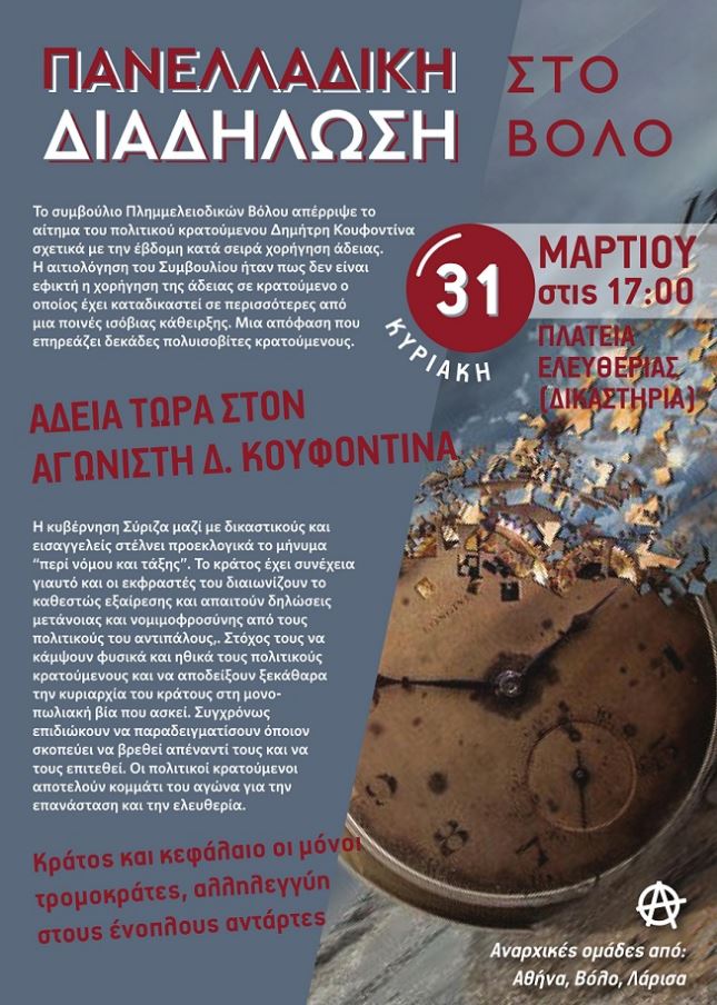 Η κινητοποίηση αυτή γίνεται στο Βόλο γιατί το συμβούλιο Πλημμελειοδικών Βόλου απέρριψε στις 27 Φεβρουαρίου το αίτημα του Δημήτρη Κουφοντίνα σχετικά με την έβδομη κατά σειρά χορήγηση άδειας.