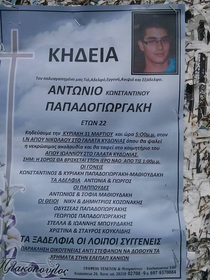 Η κοινωνία των Χανίων είναι συγκλονισμένη από τον θάνατο του 22χρονου Αντώνη.