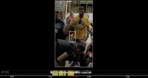 Σε άλλο σημείο, ο άντρας με το κίτρινο μπλουζάκι, φαίνεται να κρατάει ένα αντικείμενο που μοιάζει με το πτυσσόμενο κλομπ που χρησιμοποιούν οι αστυνομικοί της ομάδας ΔΙΑΣ.