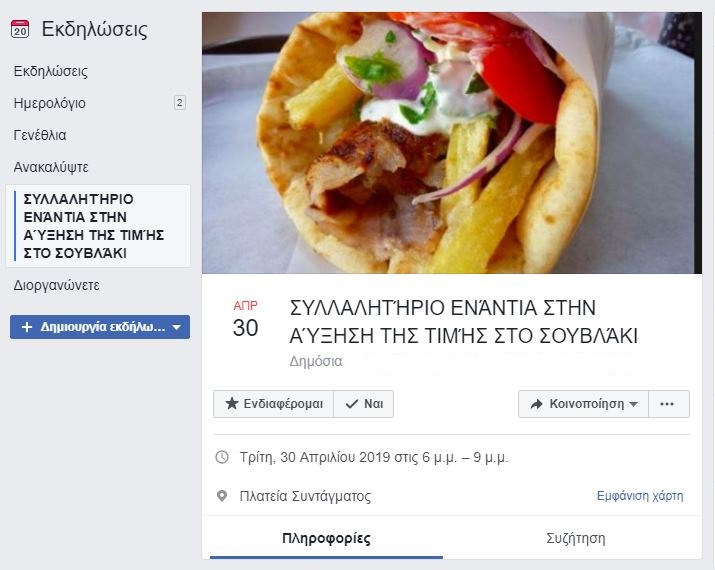 Στο event – group που έχει τίτλο «ΣΥΛΛΑΛΗΤΗΡΙΟ ΕΝΑΝΤΙΑ ΣΤΗΝ ΑΥΞΗΣΗ ΤΗΣ ΤΙΜΗΣ ΣΤΟ ΣΟΥΒΛΑΚΙ» μεταξύ άλλων έχουν «πέσει» προτάσεις για κινητοποιήσεις ενάντια στην αύξηση της τιμής του κρέατος.