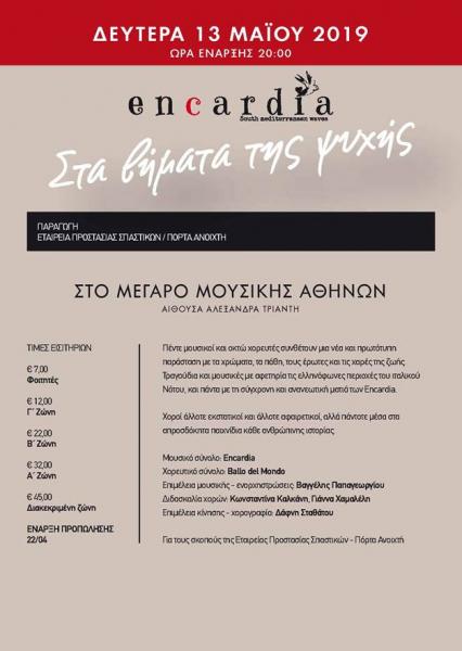 Η παράσταση «Στα βήματα της ψυχής» αποτελεί μια προσφορά του ΕNCARDIA προς την Εταιρεία Προστασίας Σπαστικών/Πόρτα Ανοιχτή ως αναγνώριση της μακρόχρονης προσφοράς της προς τα άτομα όλων των ηλικιών που πάσχουν από εγκεφαλική παράλυση, στην Ελλάδα, η δε έκπληξη της βραδιάς είναι ότι με πρόσκληση των μελών του συγκροτήματος encardia θα πάρουν μέρος στην παράσταση και μέλη της Θεατρικής Ομάδας και της χορωδίας της Πόρτας Ανοιχτής.