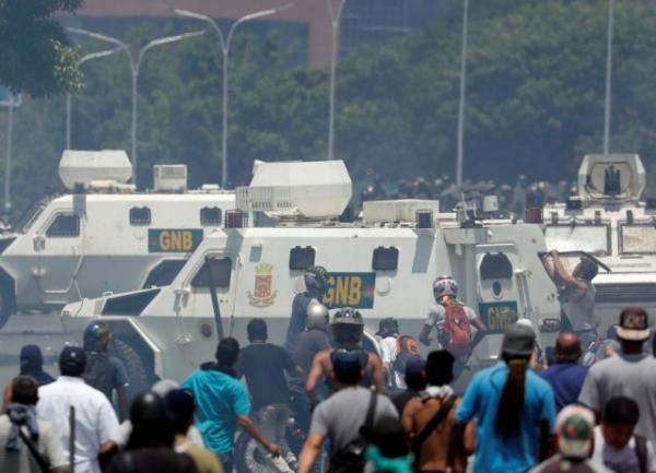 Σφοδρές μάχες μεταξύ στρατιωτών που έχουν χωριστεί στα δύο, καθώς και απλών διαδηλωτών με στρατιώτες, με πυροβολισμούς και δακρυγόνα συνθέτουν το σκηνικό «εμφυλίου» που επικρατεί στη χώρα. Πριν από λίγο μάλιστα, όχημα της Εθνοφρουράς της Βενεζουέλας παρέσυρε διαδηλωτές που είχαν συγκεντρωθεί έξω από στρατιωτική βάση στο Καράκας.