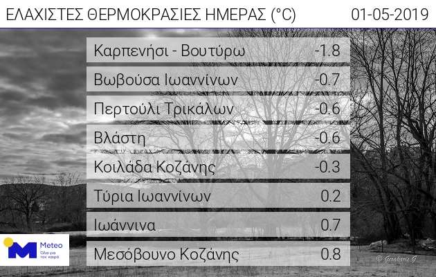 Ιδιαίτερα χαμηλές ελάχιστες θερμοκρασίες σημειώθηκαν τις πρώτες πρωινές ώρες της Πρωτομαγιάς σε ορεινά και ημιορεινά τμήματα της ηπειρωτικής χώρας, σύμφωνα με το δίκτυο αυτόματων μετεωρολογικών σταθμών του Εθνικού Αστεροσκοπείου Αθηνών/meteo.gr.