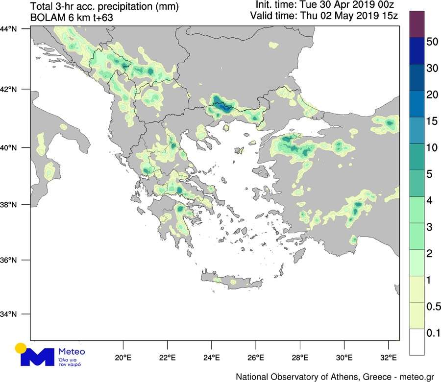 Την Πέμπτη 2 Μαΐου, όπως φαίνεται και στον προγνωστικό χάρτη που ακολουθεί, αναμένεταιάστατος καιρός με βροχές και σποραδικές καταιγίδες τις θερμές ώρες της ημέρας σε αρκετές περιοχές του ηπειρωτικού κορμού της χώρας, και ιδιαίτερα στα ορεινά.