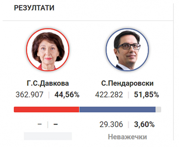 Σύμφωνα με την Εθνική Εκλογική Επιτροπή με καταμετρημένο το 97,67% των ψήφων ο υποψήφιος του κυβερνητικού συνασπισμού προηγείται με 51, 85% ενώ η υποψήφια του κόμματος της αξιωματικής αντιπολίτευσης VMRO-DPMNΕ, Γκορντάνα Σιλιάνοφσκα εξασφαλίζει 44,56 %, ή 362.000 ψήφους. Τα άκυρα είναι 3,60%.
