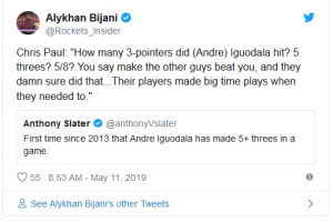 Τέλος αξίζει νομίζω να σταθούμε για λίγο, σε έναν από τους αφανείς ήρωες της συγκεκριμένης μονομαχίας. Αναφέρομαι φυσικά στον υποτιμημένο Andre Iguodala. Εκτός από την τρομερή άμυνα που έπαιξε καθ’ όλη τη διάρκεια της σειράς, στη χθεσινή αναμέτρηση ευστόχησε και σε ορισμένα καθοριστικά σουτ (5/8 τρίποντα) τιμωρώντας την επιλογή των Rockets να τον αγνοούν συστηματικά στη περιφέρεια. Η ατάκα του Chris Paul για τον Iggy, είναι χαρακτηριστική.