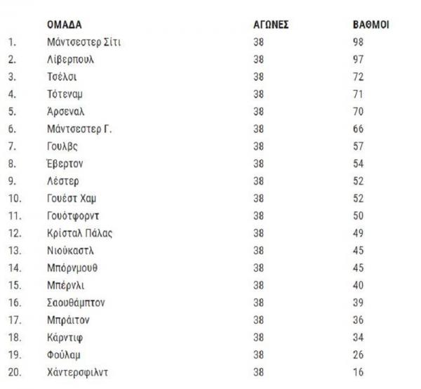 Σε ένα συγκλονιστικό φινάλε του Αγγλικού πρωταθλήματος, η Μάντσεστερ Σίτι κατέκτησε τον τίτλο έχοντας 98 βαθμούς, με τη Λίβερπουλ να τερματίζει δεύτερη (97 β.), τρίτη η Τσέλσι (72 β.) και τέταρτη η Τότεναμ (71 β.), με τις συγκεκριμένες ομάδες να παίρνουν το εισιτήριο για το Champions League.
