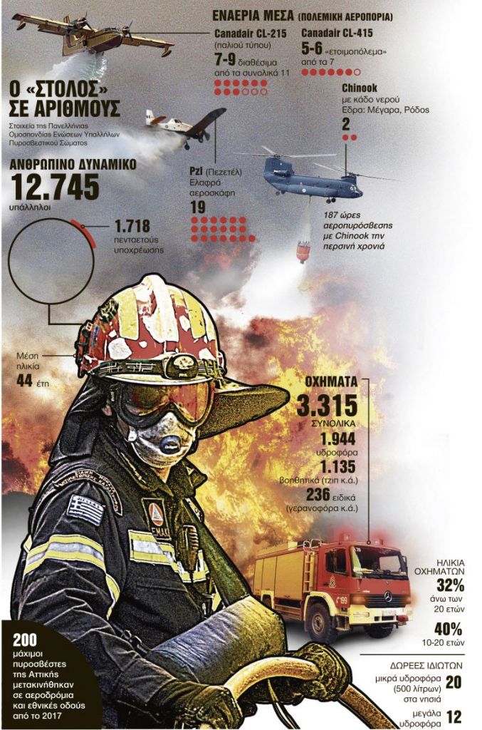 Μέχρι να προκύψουν αλλαγές πάντως οι πυροσβέστες πρέπει να συνεχίσουν το έργο τους με τους αναλογικούς ασυρμάτους (που νεκρώνουν στα δύσβατα σημεία), γδαρμένες αρβύλες και ποικίλες ελλείψεις στον εξοπλισμό τους (όπως λένε, συνήθως αγοράζουν από την τσέπη τους μάσκες των 150 ευρώ), τα οχήματα 30ετίας και τα ακινητοποιημένα λόγω βλαβών αεροσκάφη.