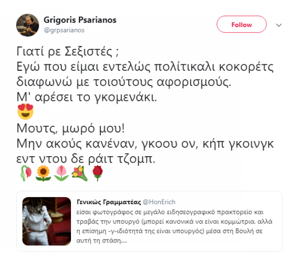 «Γιατί ρε Σεξιστές ; Εγώ που είμαι εντελώς πολίτικαλι κοκορέτς διαφωνώ με τοιούτους αφορισμούς. Μ’ αρέσει το γκομενάκι. Μουτς, μωρό μου! Μην ακούς κανέναν, γκοου ον, κήπ γκοινγκ εντ ντου δε ράιτ τζομπ», ήταν το χαρακτηριστικό σχόλιο του κ.Ψαριανού.
