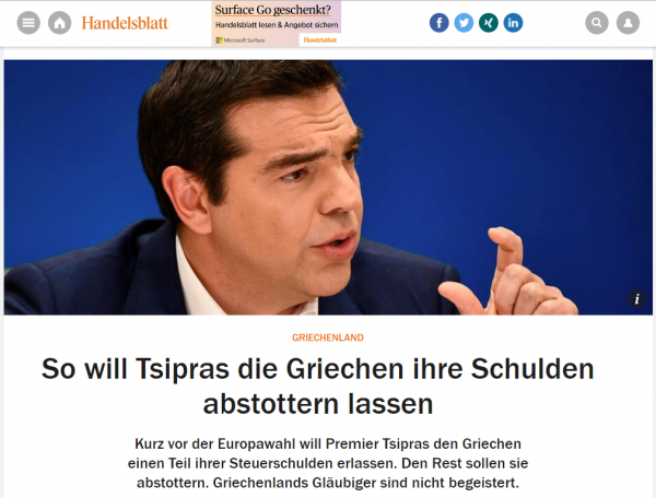 Παραμονές των ευρωεκλογών ο Αλέξης Τσίπρας θέλει να ελαφρύνει τα φορολογικά χρέη των Ελλήνων προωθώντας προεκλογικά δώρα, σχέδια τα οποία έχουν προκαλέσει δυσφορία στους πιστωτές της Ελλάδας, γράφει η Handelsblatt.