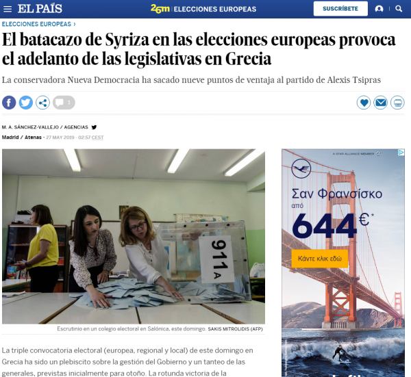 Σε εθνικές εκλογές οδηγεί η συντριβή του ΣΥΡΙΖΑ» γράφει η ισπανική El Pais, η οποία κάνει ιδιαίτερη μνεία στους συνταξιούχους. Παρά τις προεκλογικές παροχές του Τσίπρα, οι συνταξιούχοι «ήταν ένα από τα τμήματα του πληθυσμού που επηρεάστηκαν περισσότερο από το τρίτο μνημόνιο της κυβέρνησης ΣΥΡΙΖΑ και η ψήφος των οποίων ίσως αποβεί καθοριστική και στις επερχόμενες εθνικές εκλογές», γράφει η έγκυρη ισπανική εφημερίδα.