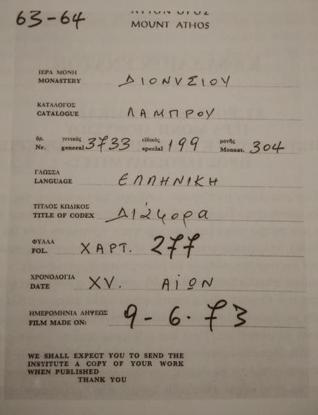 Το χειρόγραφο είναι γραμμένο στα Ελληνικά και φυλάσσεται στην Μονή Διονυσίου στο Αγιον Ορος.