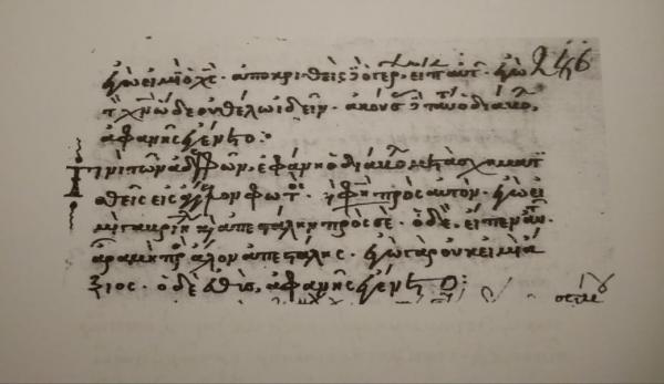 «…σὺ οὖν τί λέγεις; τοῦτο δὲ εἶπον ἐκπειράζοντες αὐτόν, ἵνα σχῶσι κατηγορίαν κατ᾿ αὐτοῦ. ὁ δὲ Ἰησοῦς κάτω κύψας τῷ δακτύλῳ ἔγραφεν εἰς τὴν γῆν. Ως δὲ ἐπέμενον ἐρωτῶντες αὐτόν, ἀνέκυψε καὶ εἶπεν αὐτοῖς· ὁ ἀναμάρτητος ὑμῶν πρῶτος βαλέτω λίθον ἐπ᾿ αὐτήν».