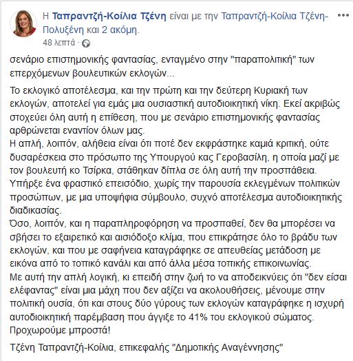 Για «Σενάριο επιστημονικής φαντασίας, ενταγμένο στην «παραπολιτική» των επερχόμενων βουλευτικών εκλογών…» κάνει λόγο, με ανάρτηση της στο facebook, η Τζένη Ταπραντζή-Κοίλια, επικεφαλής «Δημοτικής Αναγέννησης» Άρτας, με αφορμή δημοσίευμα του Πρώτου Θέματος με τίτλο «Χαμός στον ΣΥΡΙΖΑ Άρτας – Επιτέθηκαν στη Γεροβασίλη»