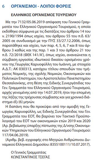 «Με την 7132/05.06.2019 απόφαση του Γενικού Γραμματέα του Ελληνικού Οργανισμού Τουρισμού, η οποία εκδόθηκε σύμφωνα με τις διατάξεις του άρθρου 14 του ν. 2190/1994 όπως ισχύει, του άρθρου 55 του π.δ. 63/ 2005 σε συνδυασμό με την ΠΥΣ 33/27.12.2006, όπως παρατάθηκε και ισχύει, των παρ. 4, 5, 6, 7 και 8 του άρθρου 3 καθώς και της παρ. 1 και 3 του άρθρου 21 του π.δ. 72/2018 (ΦΕΚ 141/Α’), όπως ισχύει, ανανεώνεται η σύμβαση εργασίας ιδιωτικού δικαίου ορισμένου χρόνου της Γεωργίας Καρυοφύλλη του Ιωάννη, με στοιχεία Α.Δ.Τ.: ΑΚ ……., κατόχου τίτλου σπουδών του τμήματος Νομικής, της σχολής Νομικών, Οικονομικών και Πολιτικών Επιστημών, του Αριστοτελείου Πανεπιστημίου Θεσσαλονίκης, στη θέση της Ειδικής Συνεργάτιδας του Γεν. Γραμματέα του Ελληνικού Οργανισμού Τουρισμού, αρχής γενομένης από την 14.07.2019, ήτοι την επομένη της λήξης της τρέχουσας σύμβασης και για χρονικό διάστημα έξι (6) μηνών» αναφέρει το ΦΕΚ υπογραμμίζοντας πως «η δαπάνη που θα προκύψει από την αμοιβή της Γεωργίας Καρυοφύλλη, ως Ειδικής Συνεργάτιδας του Γεν. Γραμματέα του EOT, θα βαρύνει τον Τακτικό Προϋπολογισμό του EOT των οικονομικών ετών 2019 και 2020».