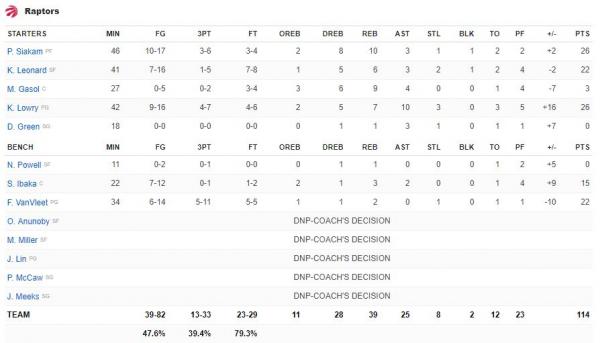 Το ματς ήταν κανονικό θρίλερ! Οι δύο ομάδες σαν μποξέρ αντάλλασσαν συνεχώς χτυπήματα, ωστόσο σε κανένα σημείο ένας από τους δύο αντιπάλους δεν κατάφερε να ξεφύγει με διψήφια διαφορά. Χαρακτηριστικό είναι μάλιστα πως το προβάδισμα άλλαξε χέρια 18 φορές κατά τη διάρκεια της αναμέτρησης. Την τελευταία και πιο κρίσιμη, οι Ράπτορς με +6 (108-102) λίγα λεπτά πριν τη λήξη. Αυτή τη φορά κατάφεραν να μην… λιποθυμήσουν όπως στο προηγούμενο ματς και πανηγύρισαν τελικά τη νίκη με 114-110.