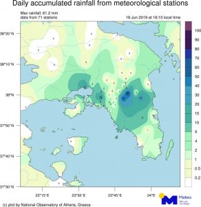 Τα ύψη βροχόπτωσης όπως αποτυπώνονται από το Μετεωρολογικό και Κλιματικό Παρατηρητήριο Αττικής την Τετάρτη 19/06/2019.