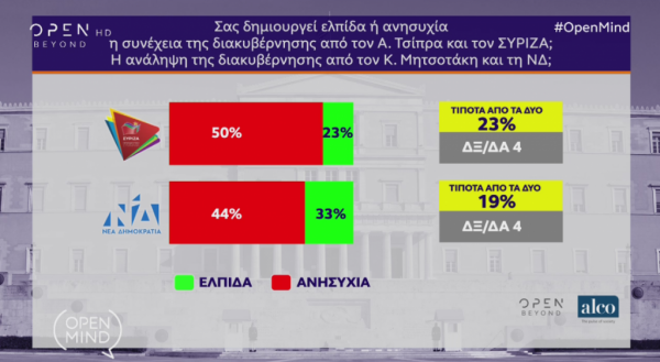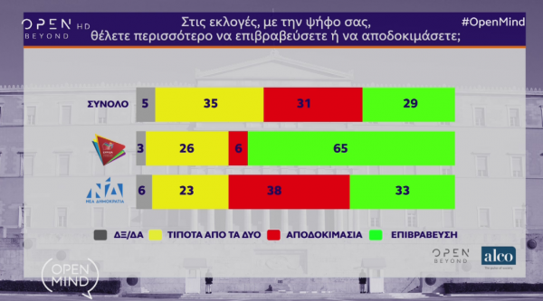 Θετικά ως προς την ανάγκη για κυβέρνηση αυτοδυναμίας απαντά το 50% των ερωτηθέντων στη δημοσκόπηση της Alco που διενεργήθηκε για λογαριασμό του Open.