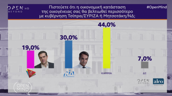 Σε ερώτηση για το εάν θεωρούν ότι θα βελτιωθεί η οικονομική κατάσταση της οικογένειάς τους μάλλον με ΝΔ ή με ΣΥΡΙΖΑ, το 30% απαντά ότι με ΝΔ, έναντι 19% που τάσσεται υπέρ του ΣΥΡΙΖΑ.