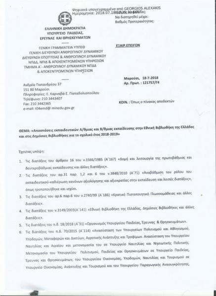 Οπως αποκαλύπτει η ιστοσελίδα tomanifesto.gr μόλις δύο 24ωρα πριν τις ευρωεκλογές (δηλαδή στις 24 Μαΐου) η σύζυγος του υπουργού Τουρισμού, Θανάση Θεοχαρόπουλου, Φρειδερίκη Γάζαρου, πήρε μετάταξη στην Εθνική Βιβλιοθήκη.