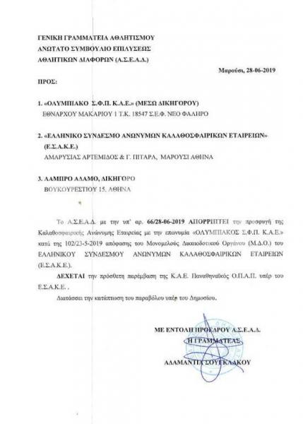 Το ΑΣΕΑΔ μάλιστα κοινοποίησε την απόφαση του αναφορικά με τις δύο προσφυγές του Ολυμπιακού, ενώ εκκρεμεί το σκεπτικό του για το πως προέβη σε αυτήν την ετυμηγορία.