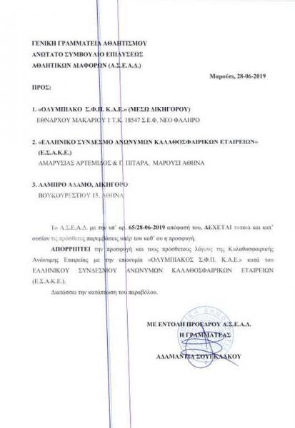 Αρνητική ήταν η εξέλιξη για τον Ολυμπιακό αναφορικά με τις δύο προσφυγές που είχε καταθέσει στο ΑΣΕΑΔ σχετικά με την επικύρωση της βαθμολογίας και τον υποβιβασμό του.
