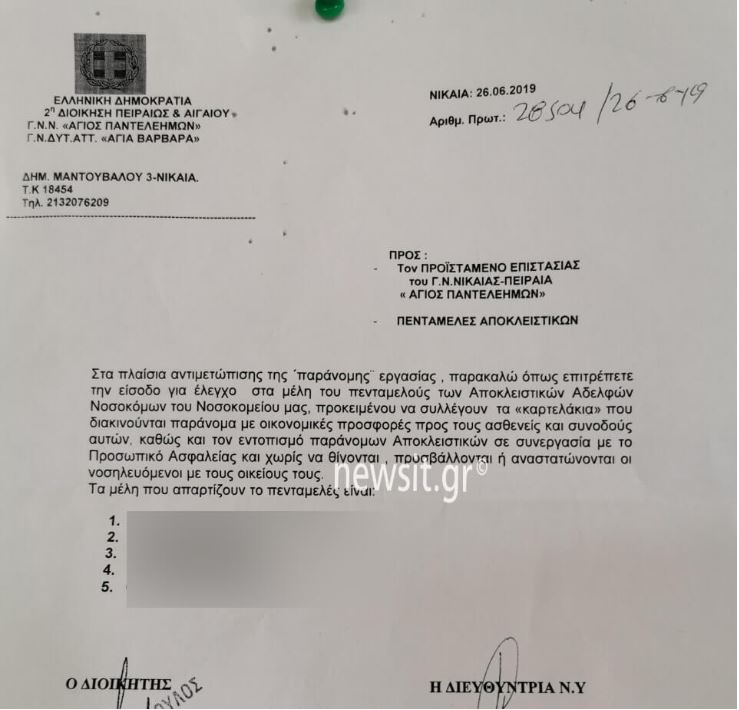«Λάβαμε γνώση σήμερα εγγράφου του νοσοκομείο της Νίκαιας, το οποίο υπογράφει ο διοικητής καθώς και η διευθύντρια νοσηλευτικής υπηρεσίας του νοσοκομείου με το οποίο δόθηκε η αρμοδιότητα στις νόμιμες αποκλειστικές νοσοκόμες να ελέγχουν και να εντοπίζουν τις παράνομες αποκλειστικές!» λέει ο Μιχάλης Γιαννακός στο Newsit.gr.