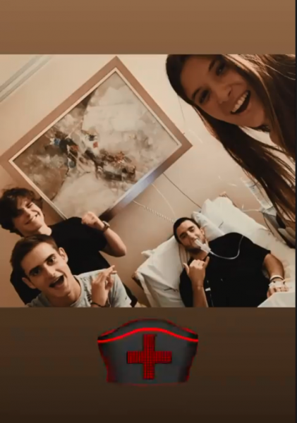 Στην φωτογραφία φαίνεται να ξαπλωμένος στο κρεβάτι με μάσκα οξυγόνου και ορό στο χέρι του ενώ γύρω του βρίσκονται οι φίλοι του. Κάτω από την φωτογραφία έχει βάλει ένα emoji, που σημαίνει ότι μάλλον όλα είναι καλά.