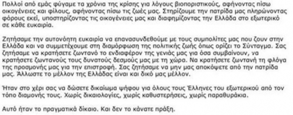 Σήμερα, προσθέτουν, από τους εκατοντάδες χιλιάδες Έλληνες του εξωτερικού, ψηφίζουν στις εθνικές εκλογές μόνο όσοι έχουν τα χρήματα και τον χρόνο για να ταξιδέψουν αεροπορικώς στην Ελλάδα. «Οι υπόλοιποι βρισκόμαστε σε έναν de facto αποκλεισμό από την πολιτική ζωή και στερούμαστε στην πράξη το συνταγματικό μας δικαίωμα του εκλέγειν».
