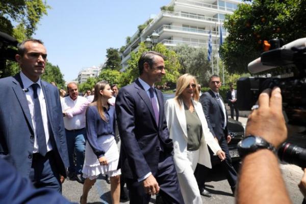 Ο Κυριάκος Μητσοτάκης έφτασε με τα πόδια μέχρι το Προεδρικό Μέγαρο έχοντας στο πλευρό του την οικογένειά του, δηλαδή την σύζυγό του Μαρέβα Μητσοτάκη καθώς και τα τρία του παιδιά την Σοφία, την Δάφνη και τον Κωνσταντίνο.