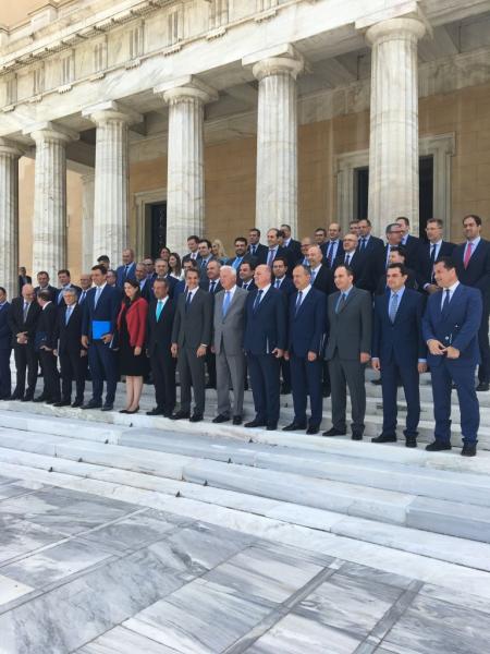 Μετά τη συνεδρίαση του υπουργικού συμβούλιου ήλθε η ώρα της καθιερωμένης αναμνηστικής φωτογραφίας στο περιστύλιο της Βουλής. Περιχαρής ο πρωθυπουργός Κυριάκος Μητσοτάκης με ένα χαμόγελο που δεν μπορούσε να κρύψει τη χαρά και την αισιοδοξία του για το νέο ξεκίνημα.