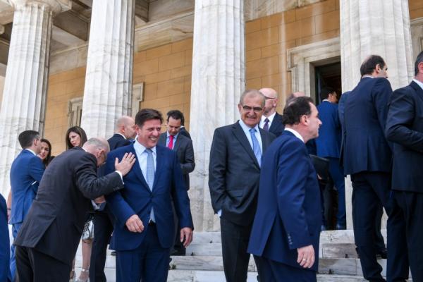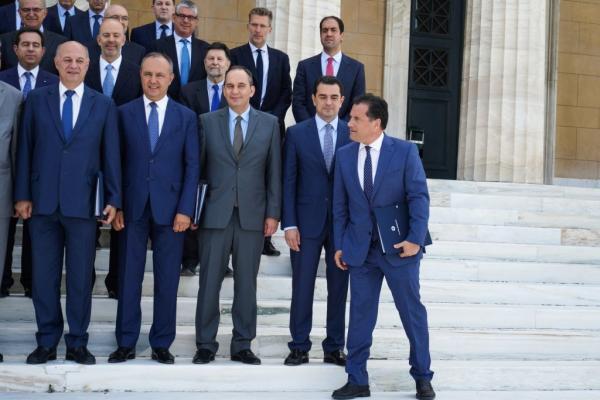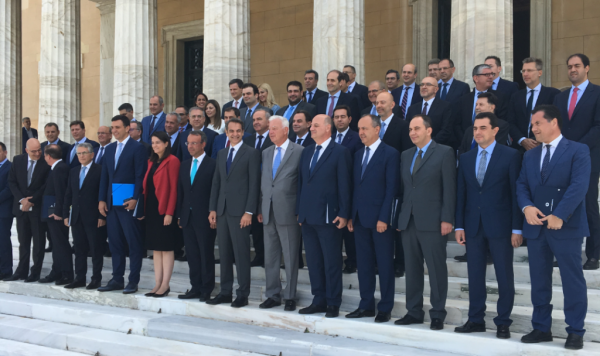 Στην οικογενειακή φωτογραφία της νέας κυβέρνησης πρωταγωνίστησε -όπως αναμενόταν- το μπλε χρώμα, στις γραβάτες, με την εξαίρεση του Χάρη Θεοχάρη που φόρεσε κόκκινη και του Γιάννη Κεφογιάννη που διάλεξε μία σε απόχρωση που θύμιζε… καρπούζι.