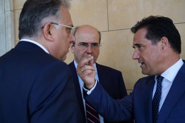 Τα πηγαδάκια που στήθηκαν στα σκαλιά της Βουλής ήταν πολλά, με τον πρωθυπουργό να έχει ιδιαίτερη συζήτηση με τον υπουργό Εσωτερικών Τάκη Θεοδωρικάκο, τον Άδωνι Γεωργιάδη κι άλλους υπουργούς.