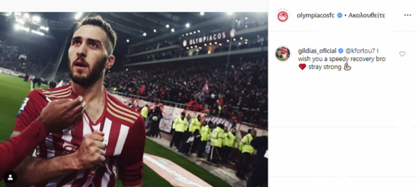 Ο Πορτογάλος εξτρέμ, Ζιλ Ντίας, ο οποίος αγωνίστηκε την περυσινή σεζόν με την ερυθρόλευκη φανέλα, ως δανεικός από την Μονακό, δεν ξέχασε τον συμπαίκτη του στην ομάδα του Πειραιά, κι έγραψε στον προσωπικό του λογαριασμό στο Istagram: «Σου εύχομαι ταχεία ανάρρωση αδερφέ… Μείνε δυνατός».