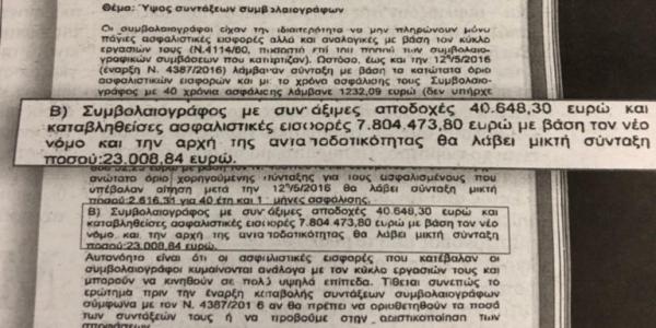 Σύμφωνα με αποκαλυπτικό έγγραφο που έχουν στη διάθεσή τους «ΤΑ ΝΕΑ», επιβεβαιώνεται πως με έγγραφο προς τη γενική διευθύντρια Συντάξεων του ΕΦΚΑ στις 10 Ιουλίου του 2018 – έναν χρόνο νωρίτερα δηλαδή – φέρεται να γίνεται προειδοποίηση από την προϊσταμένη της Διεύθυνσης Παροχών πως βάσει του επίμαχου νόμου θα μπορούσε δυνητικά σε ασφαλισμένο συμβολαιογράφο σύμφωνα με την αρχή της ανταποδοτικότητας να δινόταν μεικτή σύνταξη ποσού 23.000,84 ευρώ.