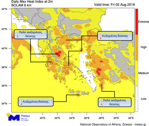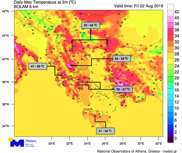 Σήμερα οι μέγιστες θερμοκρασίες στα κεντρικά ηπειρωτικά αναμένεται να φθάσουν τους 37 – 38 βαθμούς Κελσίου σε Θεσσαλία, Νότια Κρήτη, Στερεά Ελλάδα και Πελοπόννησο. Αξίζει να σημειωθεί ότι θα είναι αυξημένος είναι ο δείκτης δυσφορίας σε αρκετές περιοχές και πολύ αυξημένος στην περιοχή της Θεσσαλίας και τοπικά στη Δυτική Στερεά και στην Ανατολική Ρόδο, σε αντίθεση με την περιοχή του Αιγαίου, όπου οι βόρειοι άνεμοι διατηρούν το δείκτη σε χαμηλά επίπεδα.