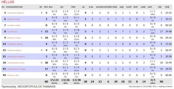 ΕΛΛΑΔΑ (Σκουρτόπουλος): Λαρεντζάκης 5 (1), Κόνιαρης 2, Αθηναίου, Καλάθης 15 (3/4 δίποντα, 2/8 τρίποντα, 3/4 βολές, 4 ριμπάουντ, 7 ασίστ, 1 κλέψιμο, 2 λάθη), Μπουρούσης 10 (0/1 δίποντο, 2/6 τρίποντα, 6 ριμπάουντ, 3 ασίστ, 4 κλεψίματα, 2 μπλοκ), Πρίντεζης 4 (2/8 σουτ), Βασιλόπουλος 3 (1), Γ. Αντετοκούνμπο 20 (4/7 δίποντα, 2/5 τρίποντα, 6/10 βολές, 1 ριμπάουντ, 2 ασίστ, 4 κλεψίματα, 4 μπλοκ, 3 λάθη), Θ. Αντετοκούνμπο 17 (5/9 τρίποντα, 5 ριμπάουντ, 2 ασίστ, 3 κλεψίματα)