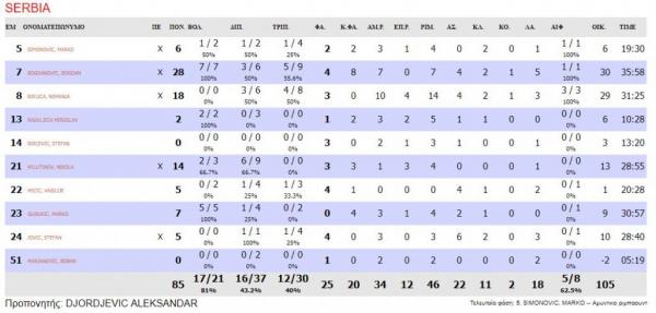 ΣΕΡΒΙΑ (Τζόρτζεβιτς): Σιμόνοβιτς 6 (1), Μπογκντάνοβιτς 28 (3/6 δίποντα, 5/9 τρίποντα, 7/7 βολές, 7 ριμπάουντ, 4 ασίστ, 2 κλεψίματα, 1 μπλοκ), Μπιέλιτσα 18 (4/8 τρίποντα, 14 ριμπάουντ, 4 ασίστ, 2 κλεψίματα, 1 μπλοκ), Ραντούλιτσα 2, Μπίρτσεβιτς, Μιλουτίνοβ 14 (6/9 δίποντα, 4 ριμπάουντ), Μίτσιτς 5 (1), Γκούντουριτς 7, Γιόβιτς 5 (1 τρίποντο, 3 ριμπάουντ, 6 ασίστ), Μαριάνοβιτς