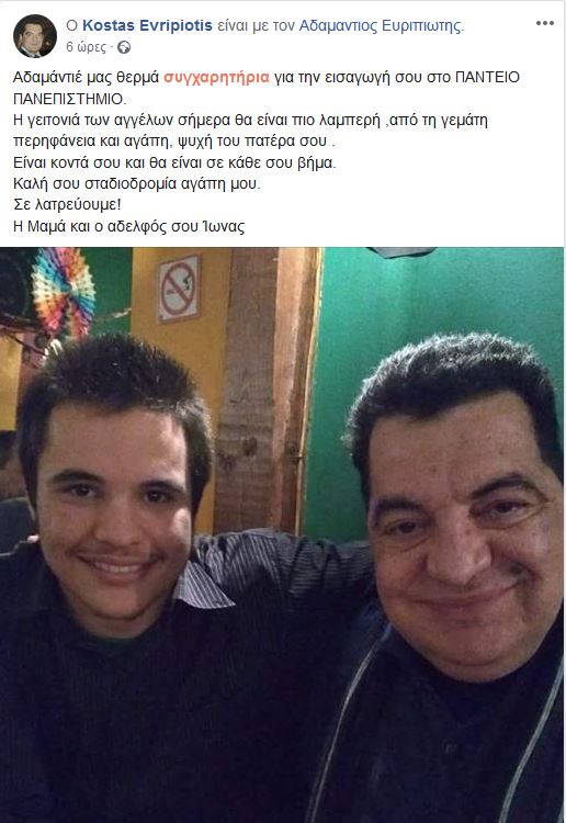 «Αδαμάντιέ μας θερμά συγχαρητήρια για την εισαγωγή σου στο ΠΑΝΤΕΙΟ ΠΑΝΕΠΙΣΤΗΜΙΟ.