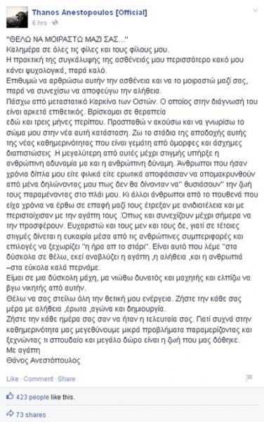 Ο Θάνος Ανεστόπουλος, με μια σοκαριστική του ανάρτηση τον Μάιο του 2015, είχε αποκαλύψει στον προσωπικό του λογαριασμό στο Facebook το σοβαρό πρόβλημα υγείας που αντιμετώπιζε, θέλοντας να μοιραστεί με τους χιλιάδες φίλους και θαυμαστές του τις πιο κρυφές του σκέψεις και τους φόβους του.