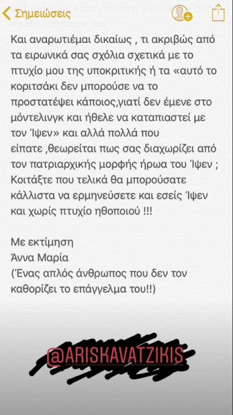 Κοιτάξτε που τελικά θα μπορούσατε κάλλιστα να ερμηνεύσετε και εσείς Ίψεν και χωρίς πτυχίο ηθοποιού!!! Με εκτίμηση, Άννα Μαρία (ένας απλός άνθρωπος που δεν τον καθορίζει το επάγγελμά του)» κατέληξε η Άννα-Μαρία Βέλλη.