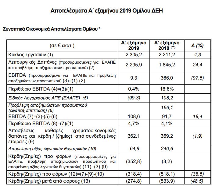 Αντίστοιχα και για λόγους συγκρισιμότητας με το α’ εξάμηνο 2018, το EBITDA της αντίστοιχης περυσινής περιόδου προσαρμόζεται με την χρέωση ύψους 108,2 εκατ. ευρώ για την κάλυψη του ελλείμματος του ΕΛΑΠΕ (η οποία καταργήθηκε από 1.1.2019) και με την πρόβλεψη αποζημιώσεων προσωπικού 166,1 εκατ. ευρώ και διαμορφώνεται σε 366 εκατ. ευρώ.