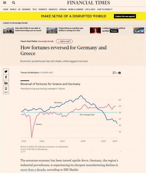 Στα θετικά μηνύματα για την ελληνική οικονομία εστιάζει δημοσίευμα των Financial Times συγκρίνοντας δείκτες της Ελλάδας και της Γερμανίας.
